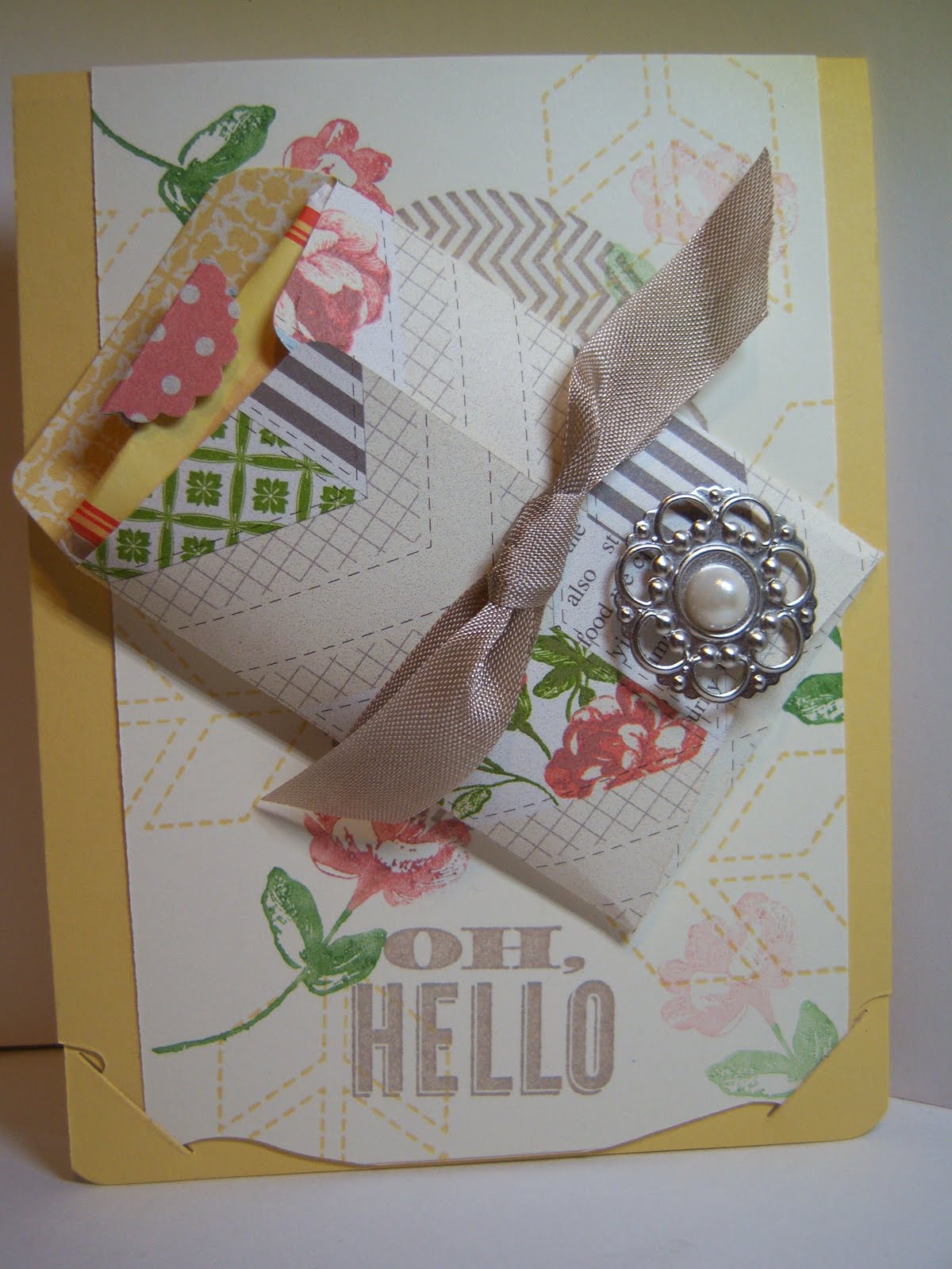 We used the Oh, Hello set with the Tea for Two designer series paper. Bitty Butterfly punch, Card base Pop n’ Cuts and the Scallop Envelope Bigz die and dimension. Oh and I love the Designer Builder Brads! I think they are my favorite thing in the Spring catalog.