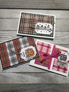 You will receive 10 white note cards and envelopes, 12 6 x 6 sheets of the Plaid Tidngs Designer Series Paper, Have a Hoot Bundle and all the supplies to make all 10 cards! Here are 3 of the designs. $70