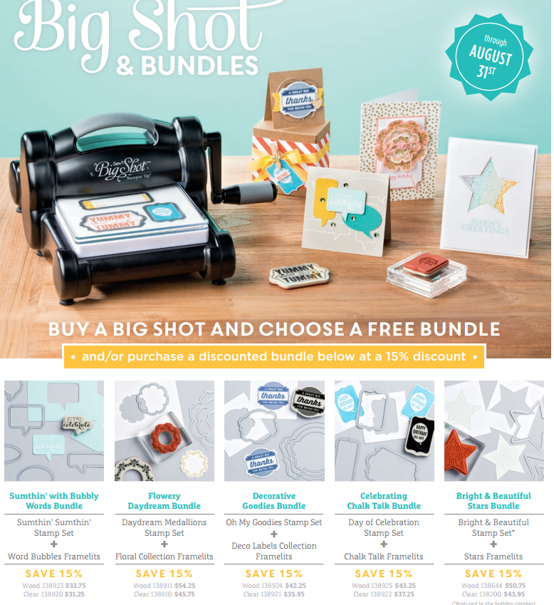 Big Shot Bundles! Stampin’ Up! Leave a Comment / By Susan / August 4, 2014 Have a great day and hope you get to stamp! Blessings, Susan