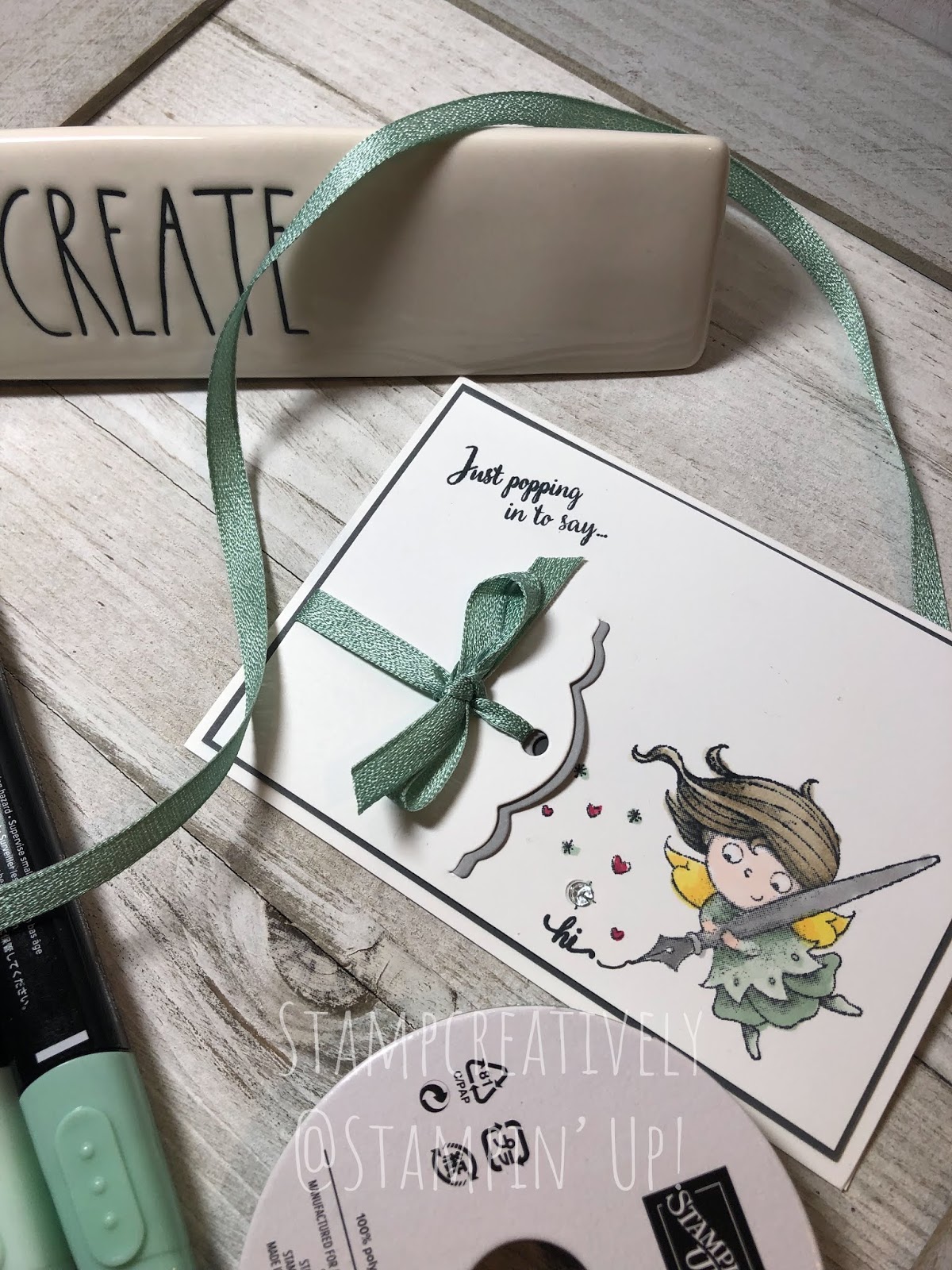Here is a card from the New Wonders Stamp set from the 2019-2020 Catalog. It’s a hostess set. I colored it with the Blends and then added the new Textile ribbon in Mint Macaron and the tag insert comes from the Perfect Parcel dies. I did it on a Note Card and Envelope.