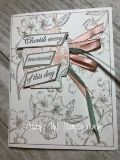 Love the Forever Blossoms Bundle. It’s stamped in gray granite and very simple to create. Love the ribbon! Its a great wedding or birthday card or just a reminder that that we need to Cherish our days.