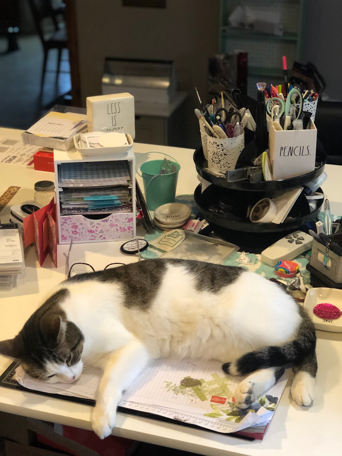 Ok so I came down to stamp and this is what was in my spot. Well getting him up may not have been worth it. I have sticky paper on my desk to hold dimensions backs and he stepped in it. He couldn’t get it off without knocking so many things of the table! That darn cat 😊