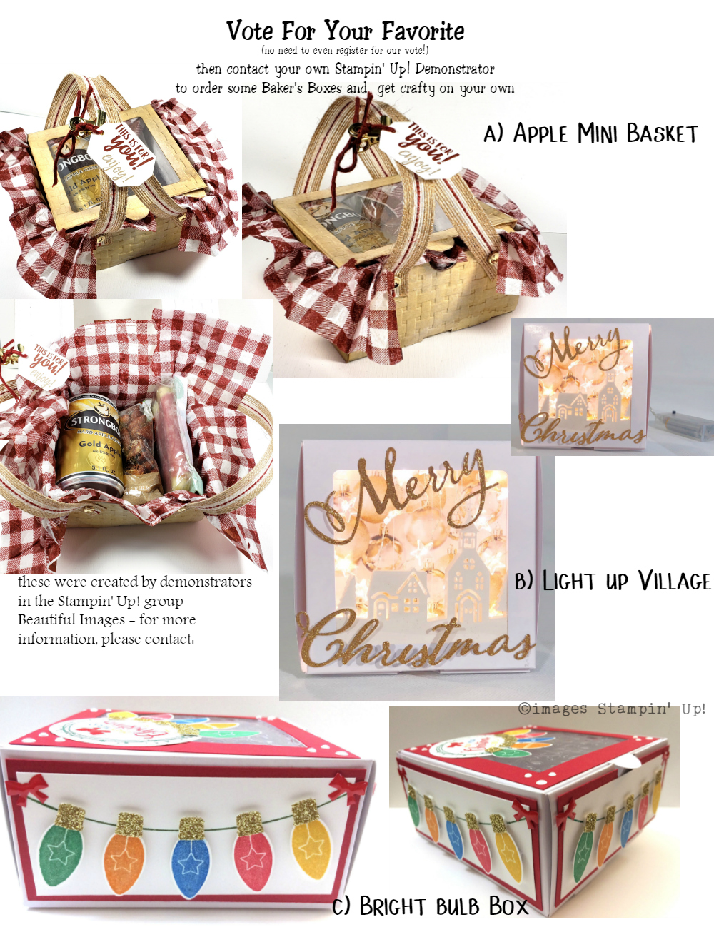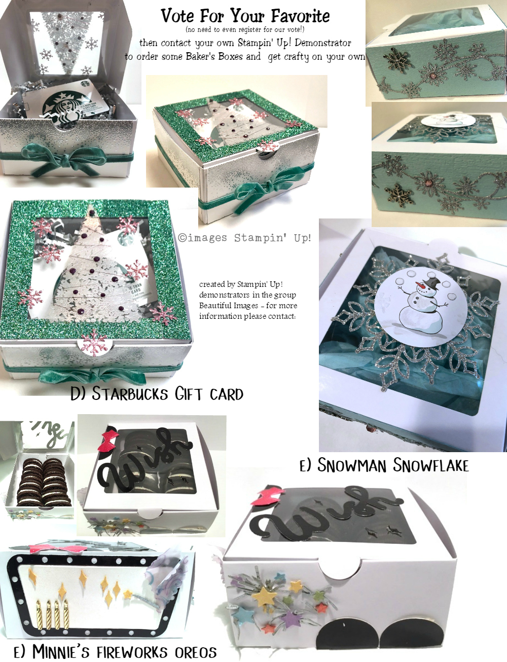 Stampin’ Up! Baker’s Box challenge Leave a Comment / By Susan / October 14, 2018 Here are some fun projects with the Stampin’ Up! Baker’s boxes on page 49 of the Holiday catalog. Vote for your favorite – there are prizes involved! Have a great day and hope you get to stamp! Blessings, Susan
