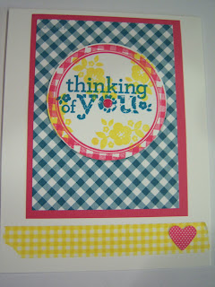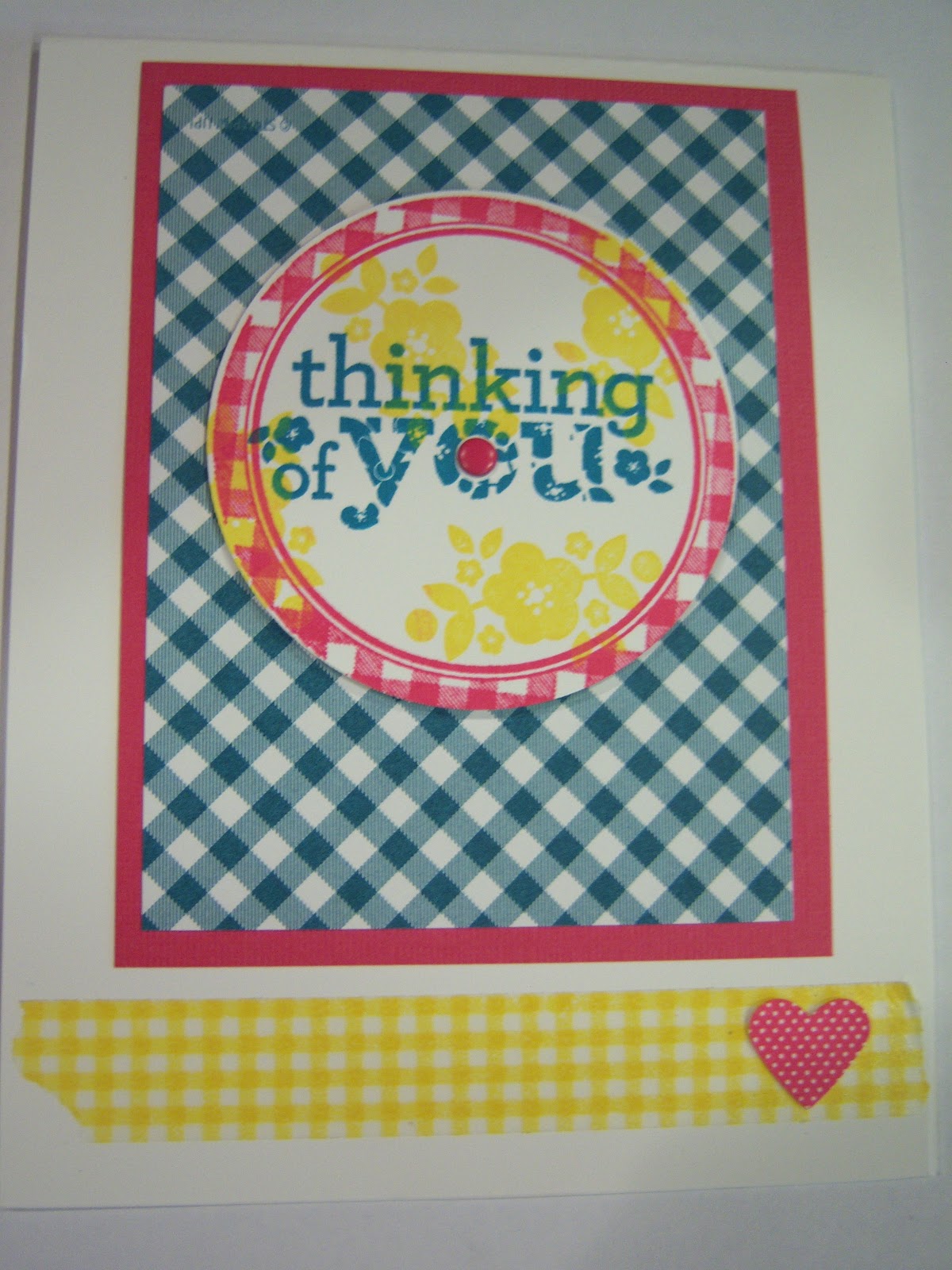 Finally getting some goodies from the NEW Stampin’ Up! Catalog. Here is one of my quick favorites, especially because I can use Washi Tape with it! Kind & Cozy, Gingham Garden Washi tape and Gingham Garden Designer Series Paper. Oh, and don’t forget the Candy Dot in the center! One happy stamper here 🙂