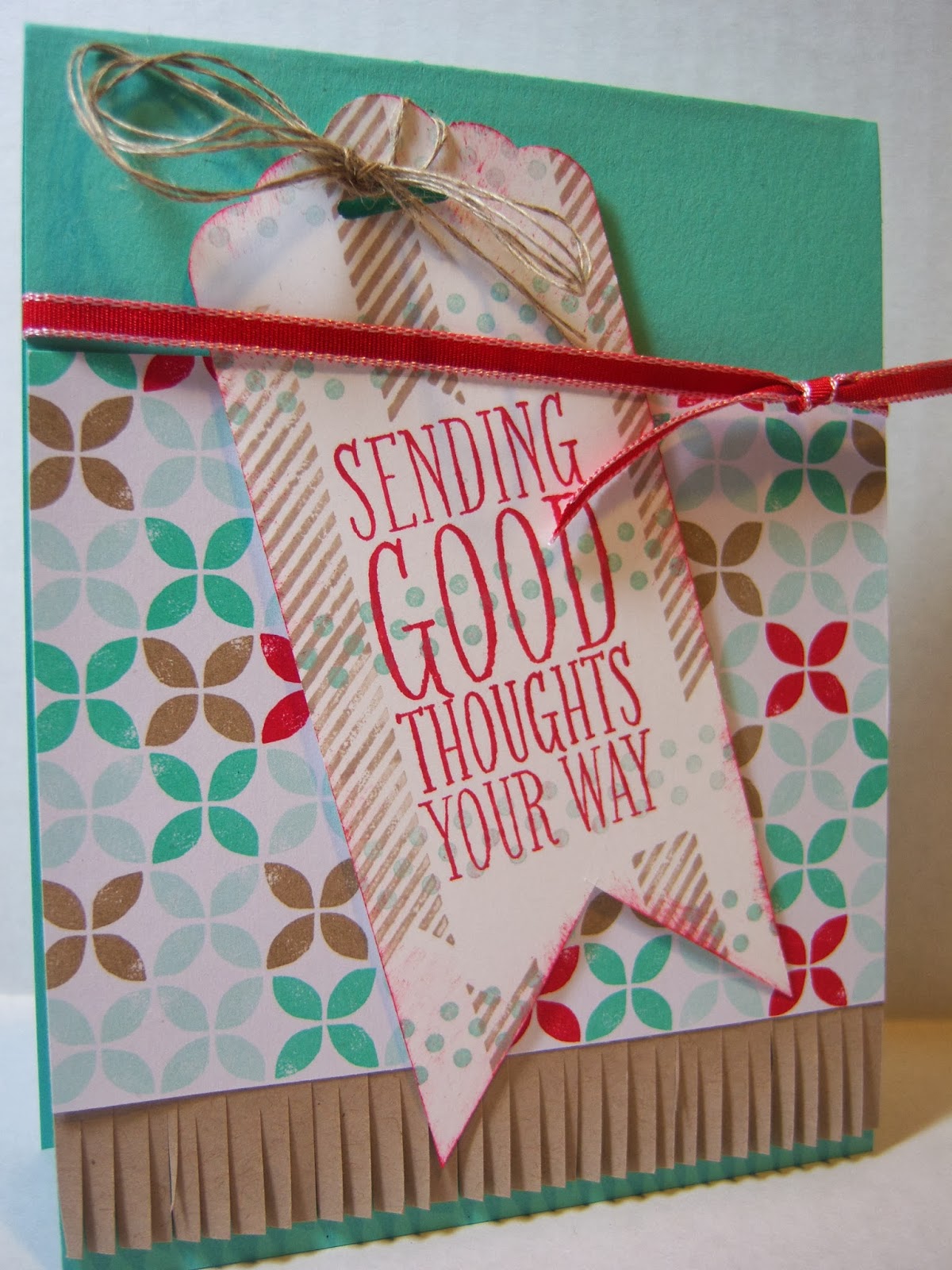 Here are some goodies from the Occasions catalog, Fringe scissors, Fresh Prints Designer series paper pack, Scalloped Tag Topper punch, and Perfect pennants stamp set.