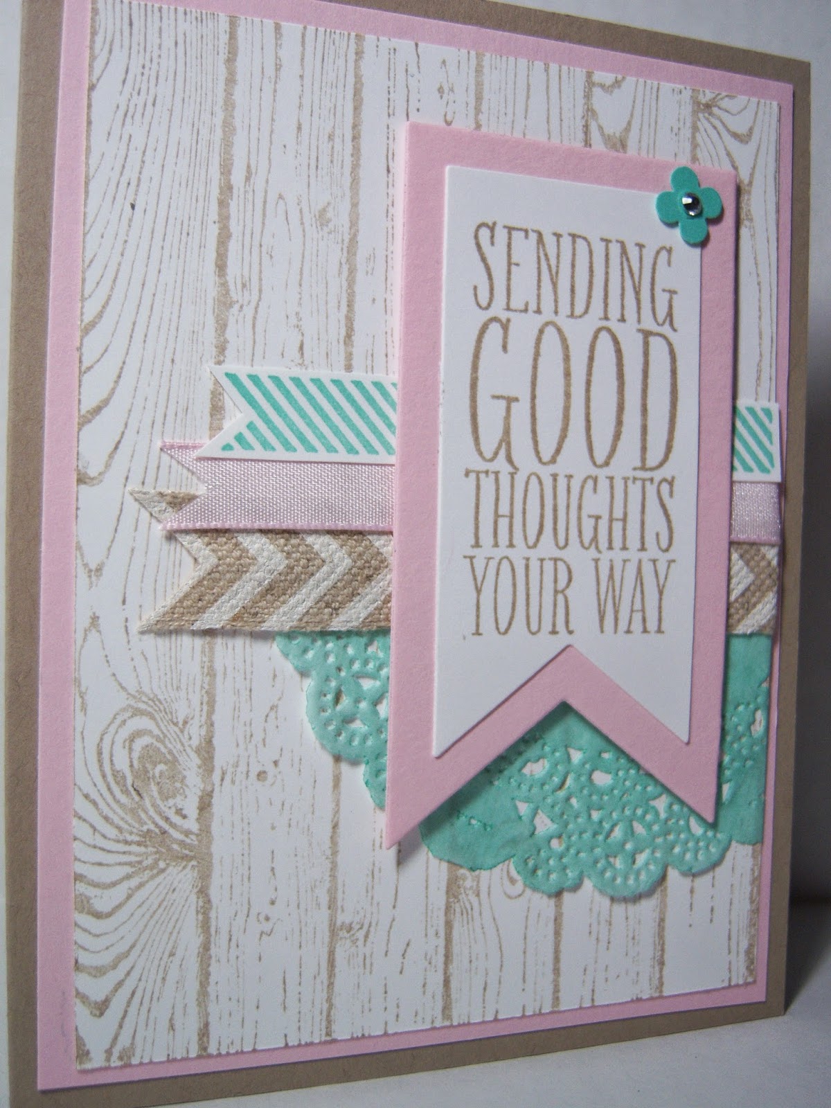 Here is the Perfect Pennants bundle and Hardwood background stamp mixed in a soft way. Love the colors, thanks Amy B for sharing and Demonstrator training