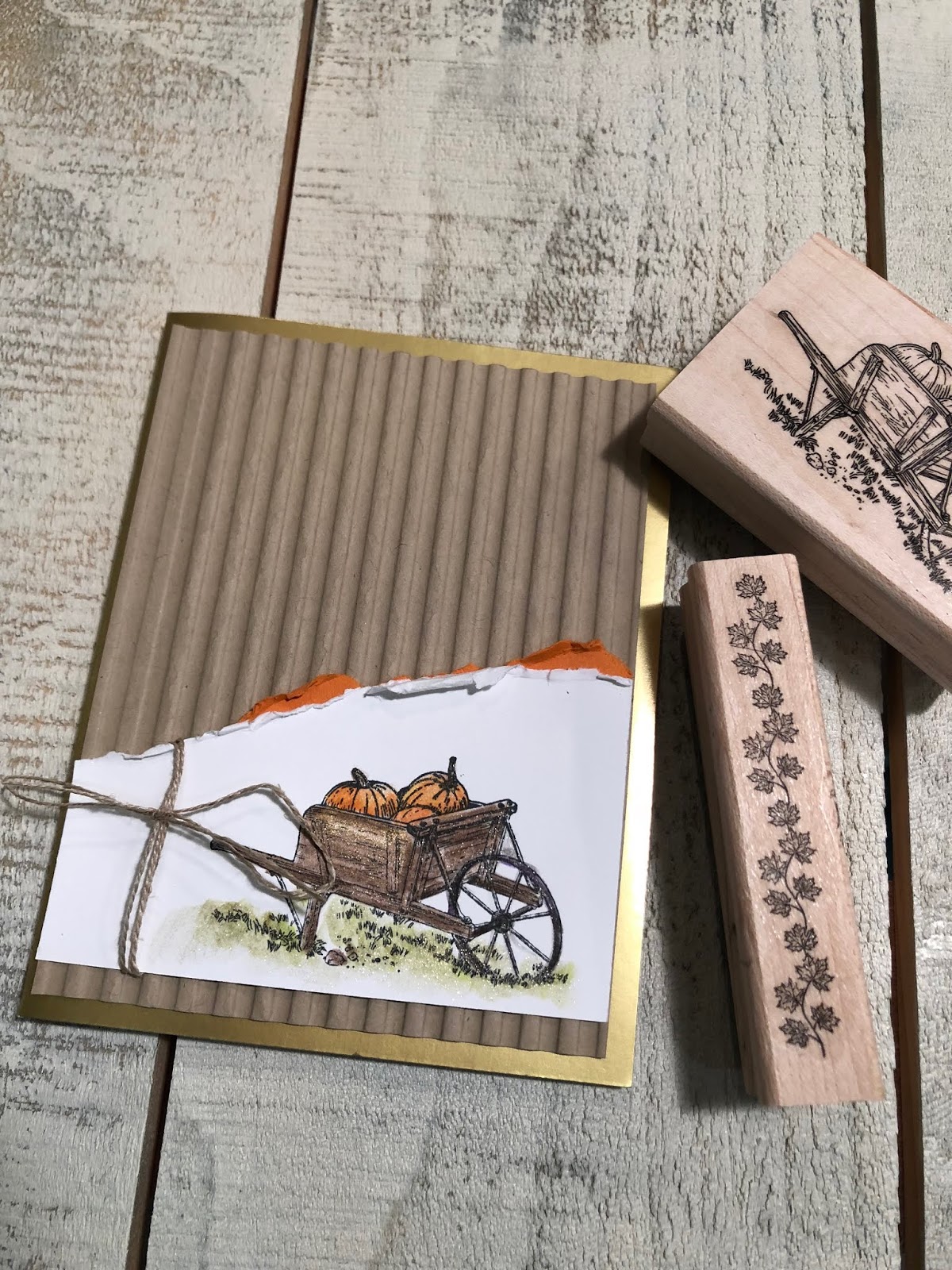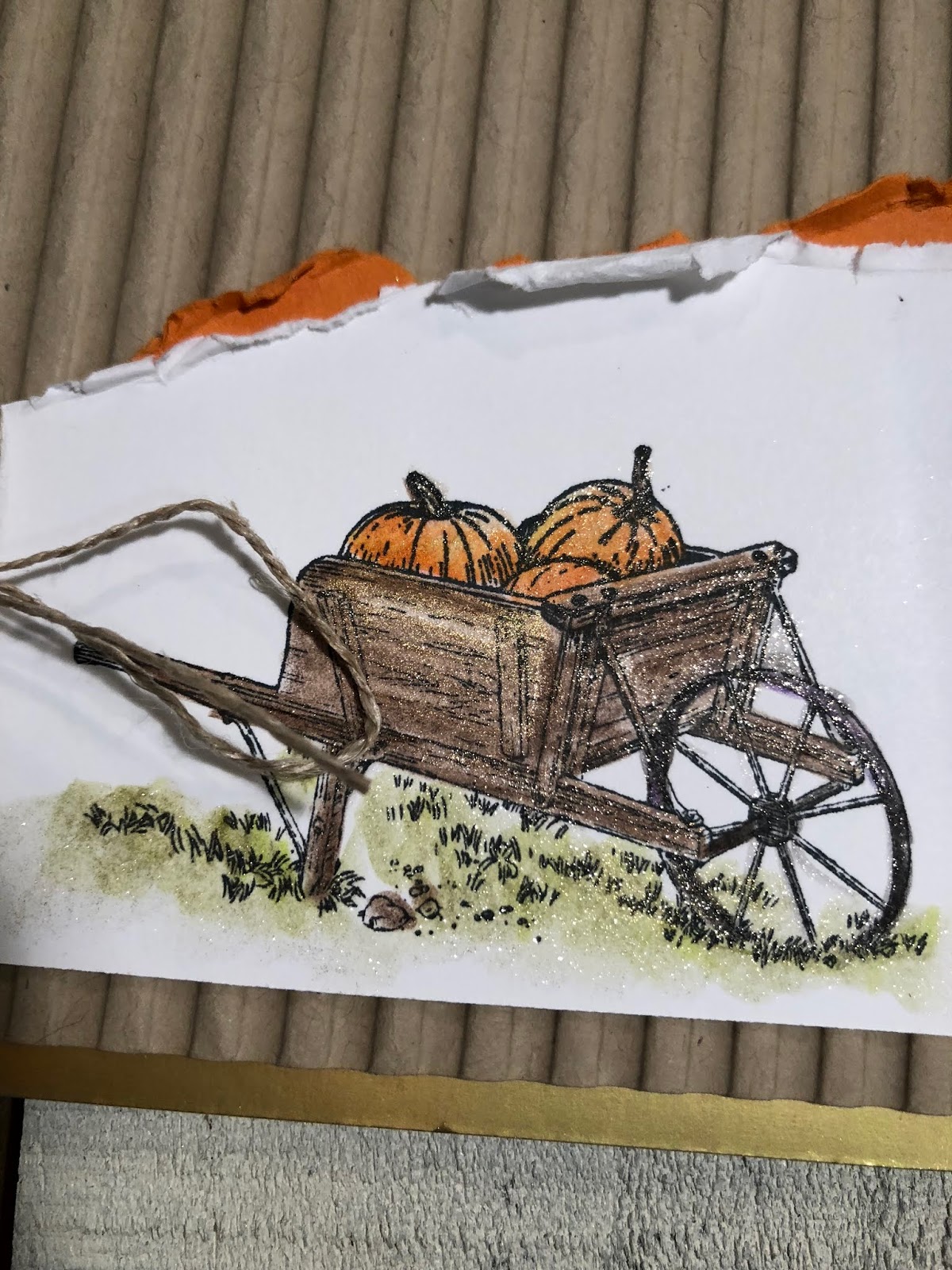 The wagon is colored with the colored pencils and then blended with the gold shimmer paint. It’s beautiful on the Foil-Edged cards and envelopes. The corrugated dynamic textured impression embossing folder reminds me of the crimpers we had years ago. Hope you can make this at camp.