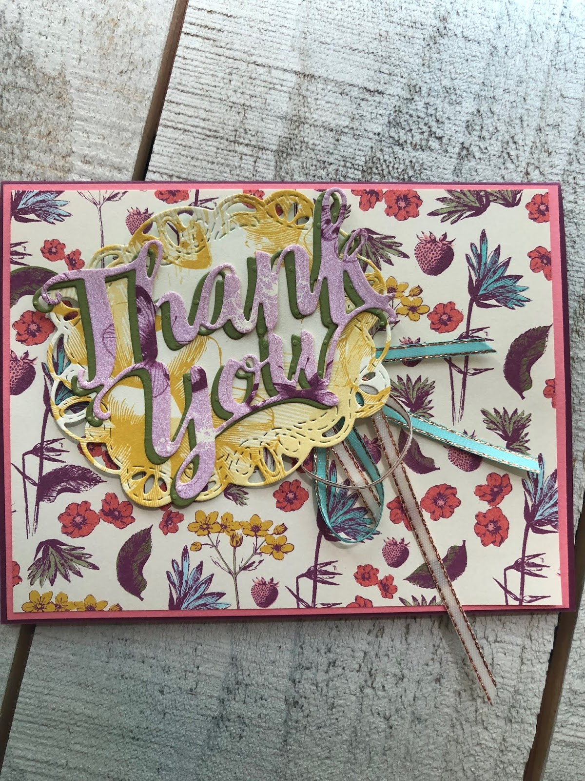 Some great new Thinlits and Designer Series paper. Love the new patterns and colors. Tea Room Speciality Designer Series Paper and check out the ribbon Tea Room combo pack, they are both in the same package. Stampin’ Up! makes it easy to have a color coordinated card.