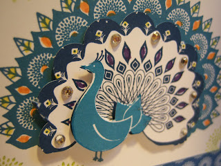 We did this card in the fall with the World Treasures stamp set. It says in the new catalog but the Designer Series paper goes. It was a simple card to do. We cut out the body of the peacock but the Midnight Muse portion was punched. Love all the blues together.